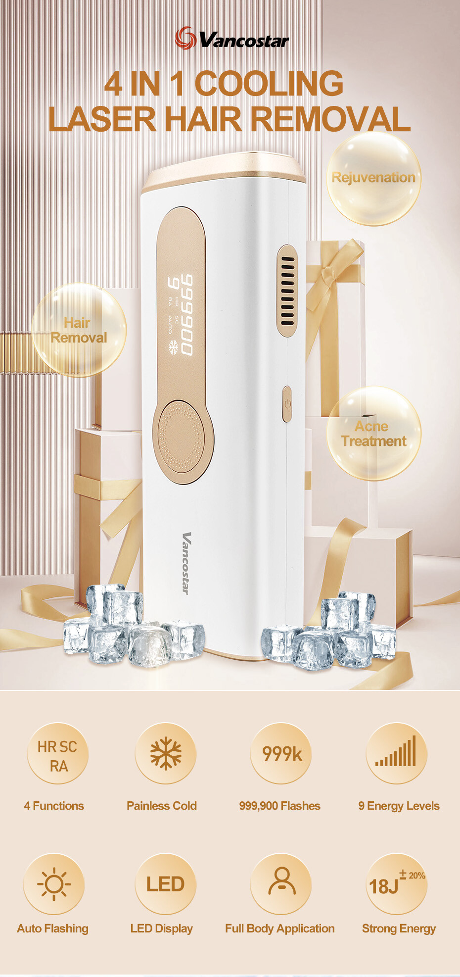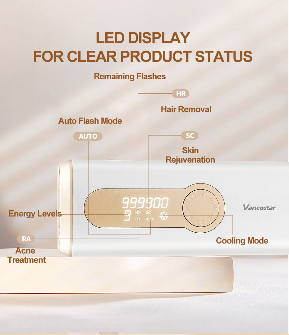 Фотоепилатор Vancostar Ice Cool с охлаждащ ефект, 1 Милион импулсa, ЛЕД Дисплей, предпазване и подмладяване на кожата, лекуване на акне